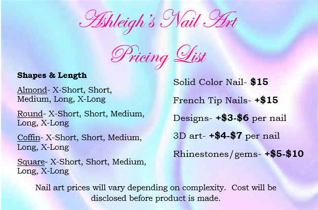 Have your own creations come to life! Get a fully customizable set of nails, made to order. A $15 non-refundable deposit is required with this order.
